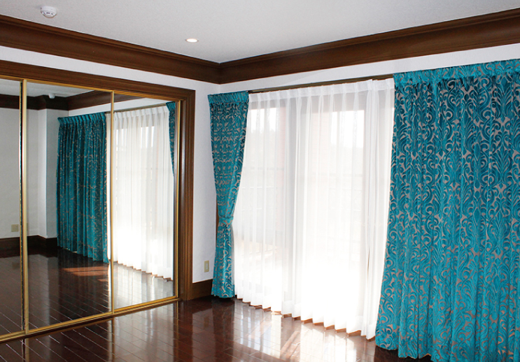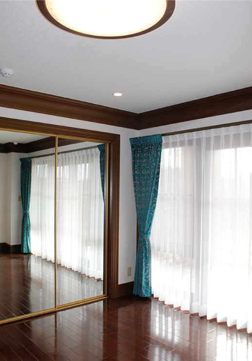カーテンと壁のバランスをとることにより、豪華で華やか且つ、落ち着きのあるお部屋を実現しました。