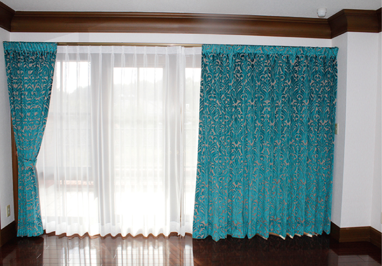 当店にご来店された際、展示されていた以前の事例のカーテンをご覧になって、デザインを一目で気に入られ、決定されました。生地は「サンゲツ」のベルベットの生地を使用しています。リビングは吹き抜けで床から窓面が6メートルの高さまであり、大きなシャンデリアと広いらせん階段がまるでホテルのロビーのようでした。真紅のカーテンを見栄え良くというリクエストを頂き、ただ普通のカーテンのみだとつまらないと感じました。そこでバランスの丈を長くし、ゴールドのフリンジを付けてアクセントにすることでよりゴージャスな雰囲気になるよう提案しました。取付は足場を組む大がかりなものとなりました。取付を見守っていらっしゃったお客様から、「これは素晴らしい」と何度も言っていただき、施工が完了した際にも「とても満足です」と行って頂けたのでホッとしました。