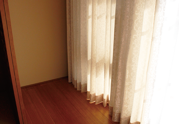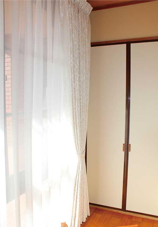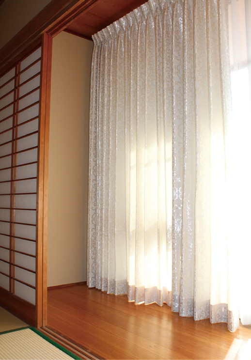 白を基調とし、シンプルでありながらも、柄があってキラキラとした光沢のある「スミノエ」の生地を使用しています。和室にもカーテンをつけたいとのことでしたが、和の雰囲気を壊さないものをご希望されていたので、和室の元々の雰囲気はそのままに、落ち着いた雰囲気になるようにしました。